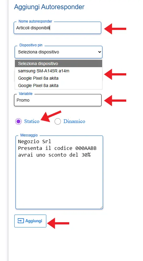 Nella modalità statica, alla ricezione di un SMS contenente una determinata variabile (cioè una parola chiave) viene inviata una risposta fissa, impostata da voi.